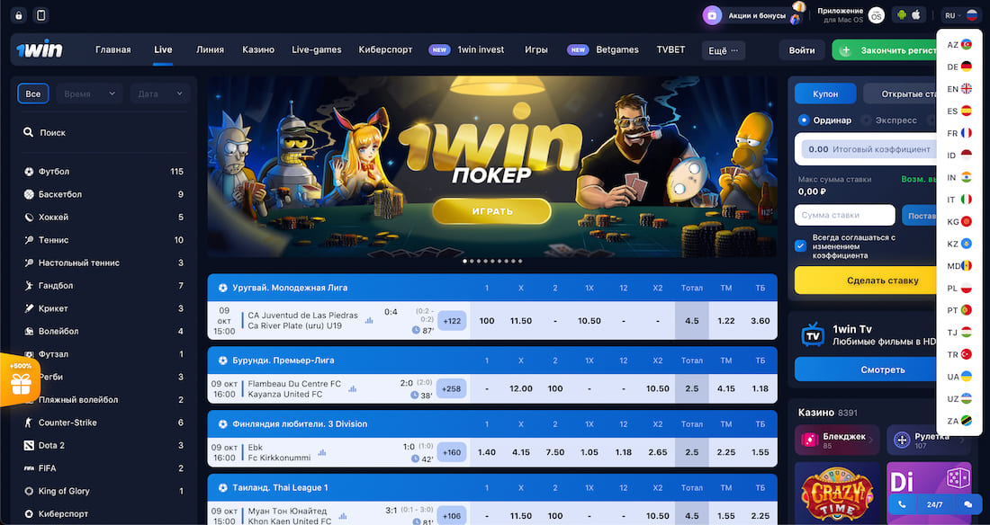 Букмекерская контора 1 Вин выделяется удобным и продуманным интерфейсом. Основные разделы расположены в зоне быстрого доступа, что позволяет легко переключаться между лайв-ставками и прематчем. Процесс заполнения купона прост и понятен даже для новичков.